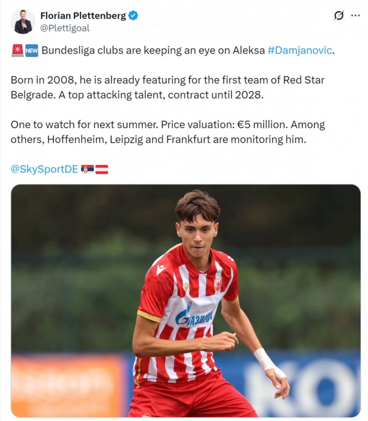 普莱滕伯格指出,16岁先锋达姆贾诺维奇仍是为红星一线队出场,他与俱乐部的条约2028年到期。这位小将明夏的动向值多礼贴,球员估价500万欧元,霍芬海姆、莱比锡、法兰克福等俱乐部王人在怜惜球员。