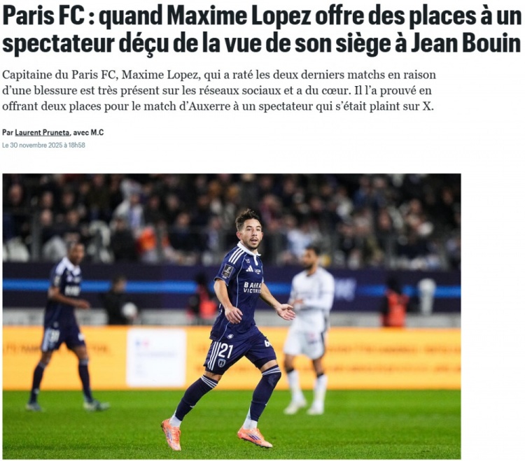 12月2日讯 《巴黎东说念主报》报说念,巴黎FC队长马克西姆·洛佩斯在酬酢媒体上私信敌手球迷,给对方送票。