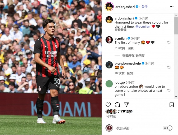 亚沙里更新社媒动态,晒出比赛像片,配文:“很荣幸初度身披米兰球衣插足比赛。”