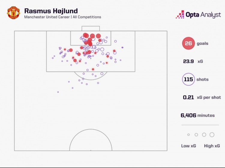 数据网站OPTA也盘货了霍伊伦曼联糊口射门后果情况,他在各项赛事6406分钟登场时间中完成115次射门,打进26球,平均每246分钟打进一球。