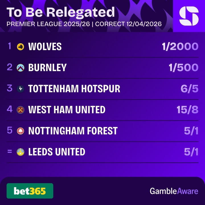 04月12日讯 英超第32轮,热刺客场应战 0-1不敌桑德兰深陷降级泥沼,相关机构更新了最新的英超降级赔率。