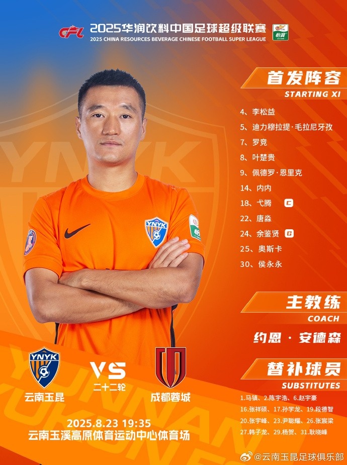 中超第22轮对阵成王人蓉城,云南玉昆首发出炉!