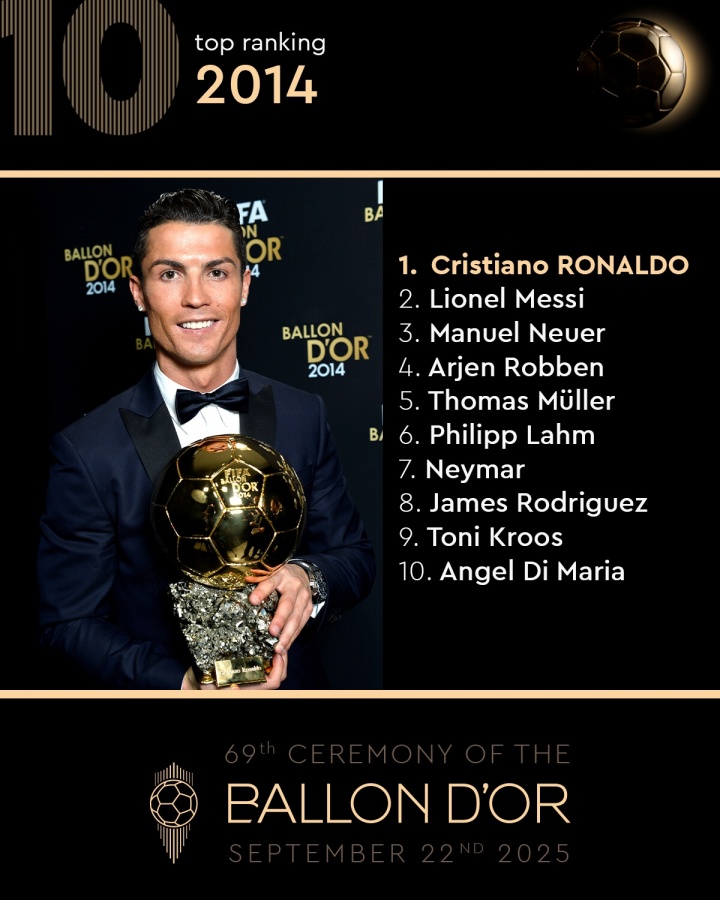 08月23日讯 金球奖官方不息每天一期盘货往届金球得主,预热一个月后的2025金球受奖仪式,今天来到了2014年。2014年C罗取得了我方生存的第3座金球奖,梅西、诺伊尔名次前三。