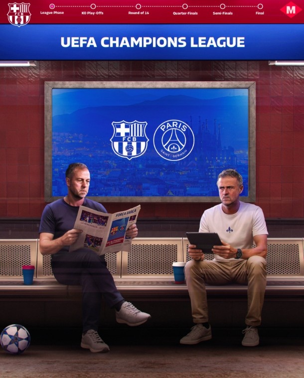 10月1日讯 巴萨发布欧冠对阵巴黎海报,两队主老师出镜亮相。