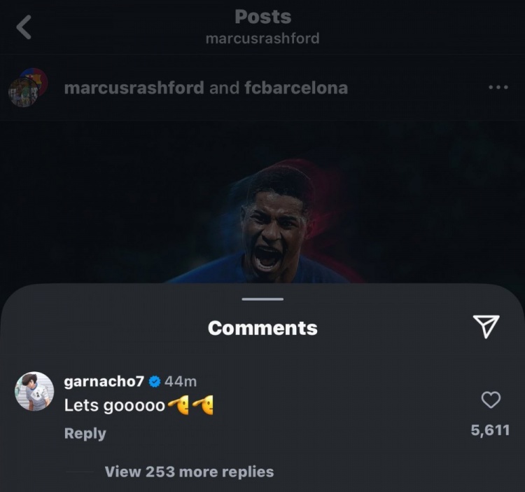 加纳乔在拉什福德官宣社媒下留言谈:“Let’s go!(直译为“让咱们开赴”,也可意会为“冲啊!加油!”)🫡🫡”并配上了“敬礼”表情。