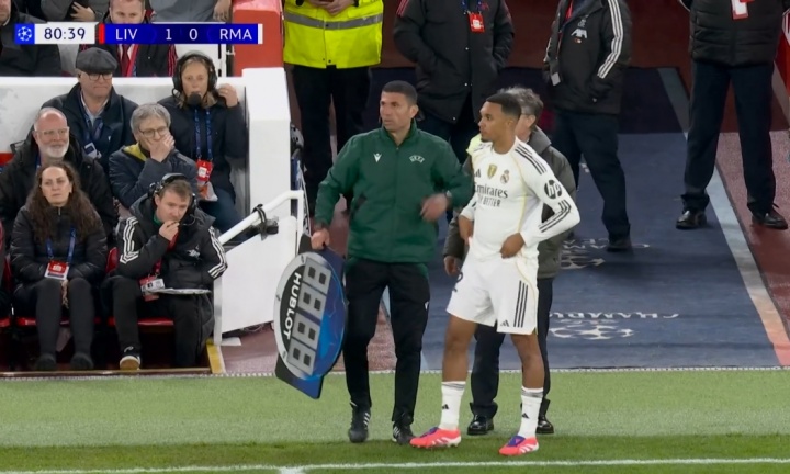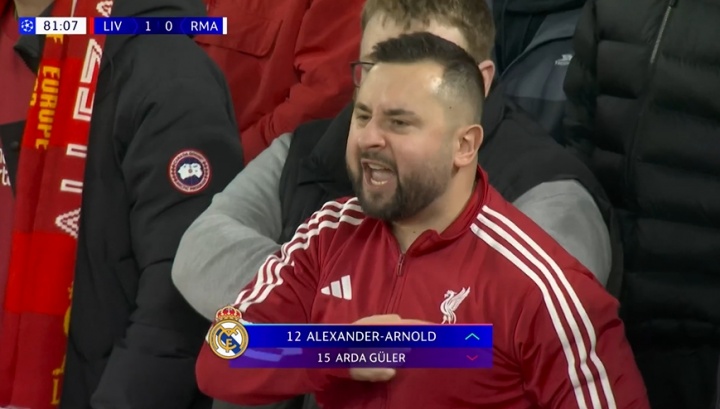 11月05日讯 利物浦vs皇马第81分钟,阿诺德登场换下居莱尔,安菲尔德嘘声震天!