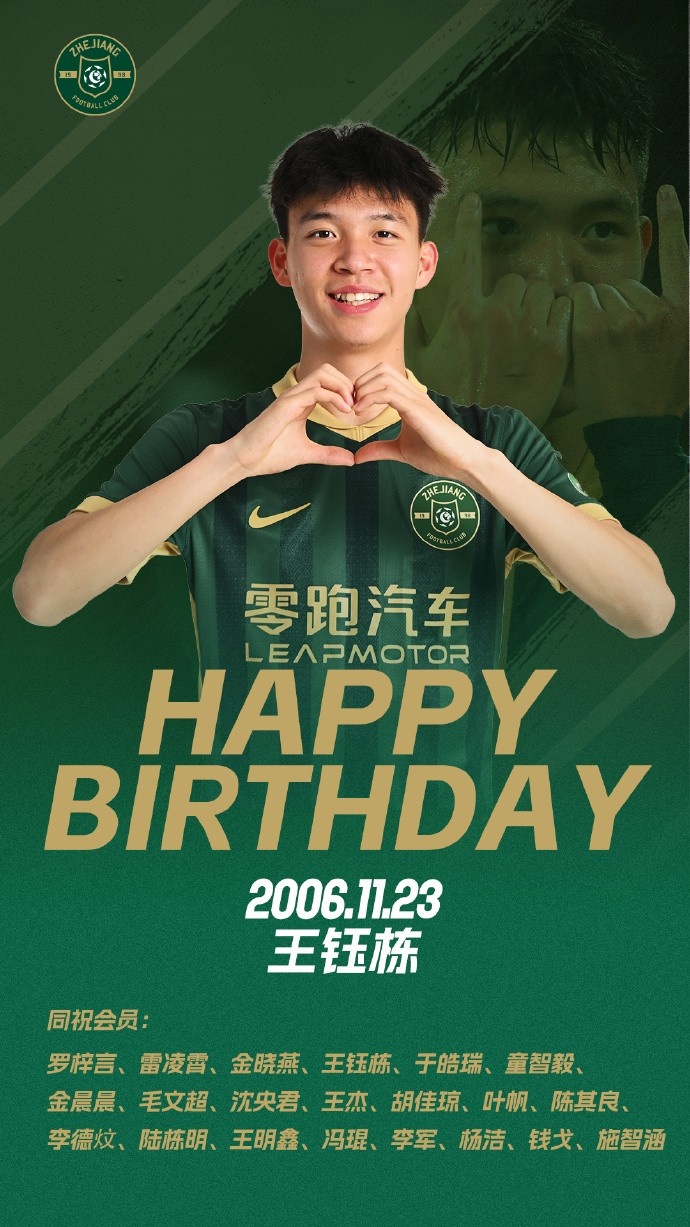 11月23日讯 今天是王钰栋19岁寿辰,浙江队官方发文送祝愿。