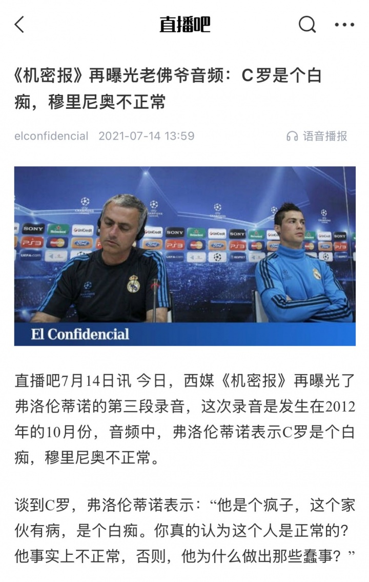 《好意思妙报》于2021年接连曝光了多条弗洛伦蒂诺的通话灌音,其中的爆炸言论包括“C罗是个疯子”、“穆里尼奥不常常”、“卡西几乎是哈巴狗”、“劳尔、卡西是骗子”等等。