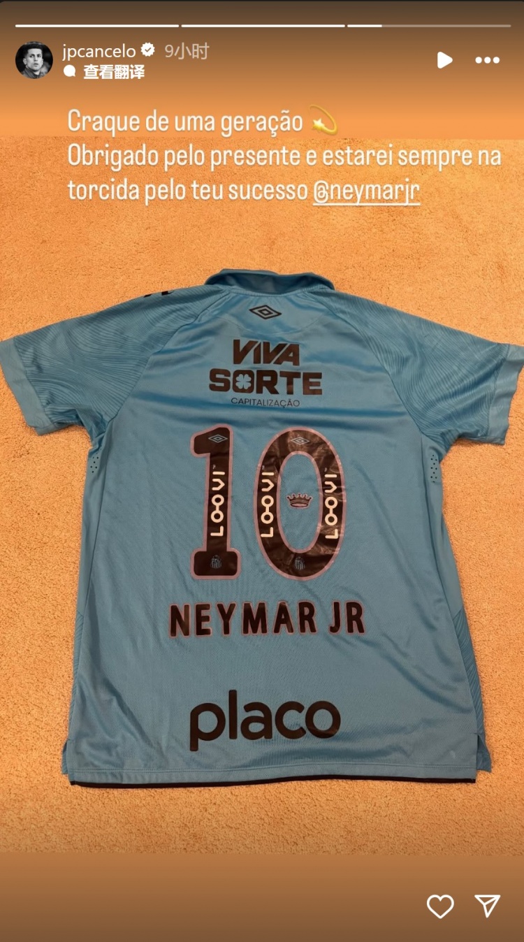 坎塞洛获赠内马尔球衣,他在外交媒体上晒出球衣的像片,配文:“一代巨星,感谢你的礼物,我会一直为你加油!”