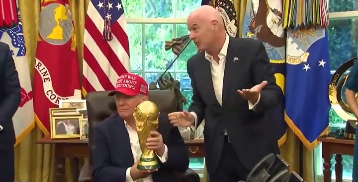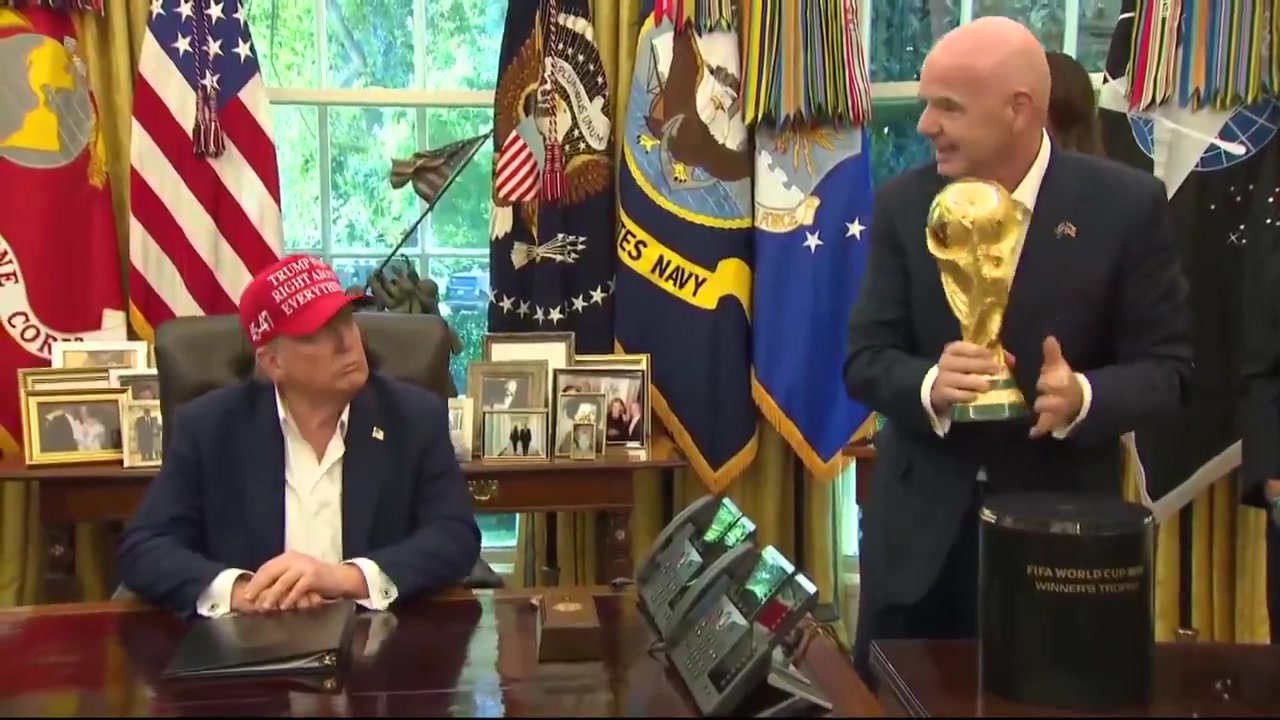 因凡蒂诺拿着恣意神杯对特朗普说谈:“这个奖杯只属于赢家,你是胜者,固然你不错摸摸它。这很重,上一位捧起这座奖杯的东谈主是梅西,现时奖杯就在这里。”