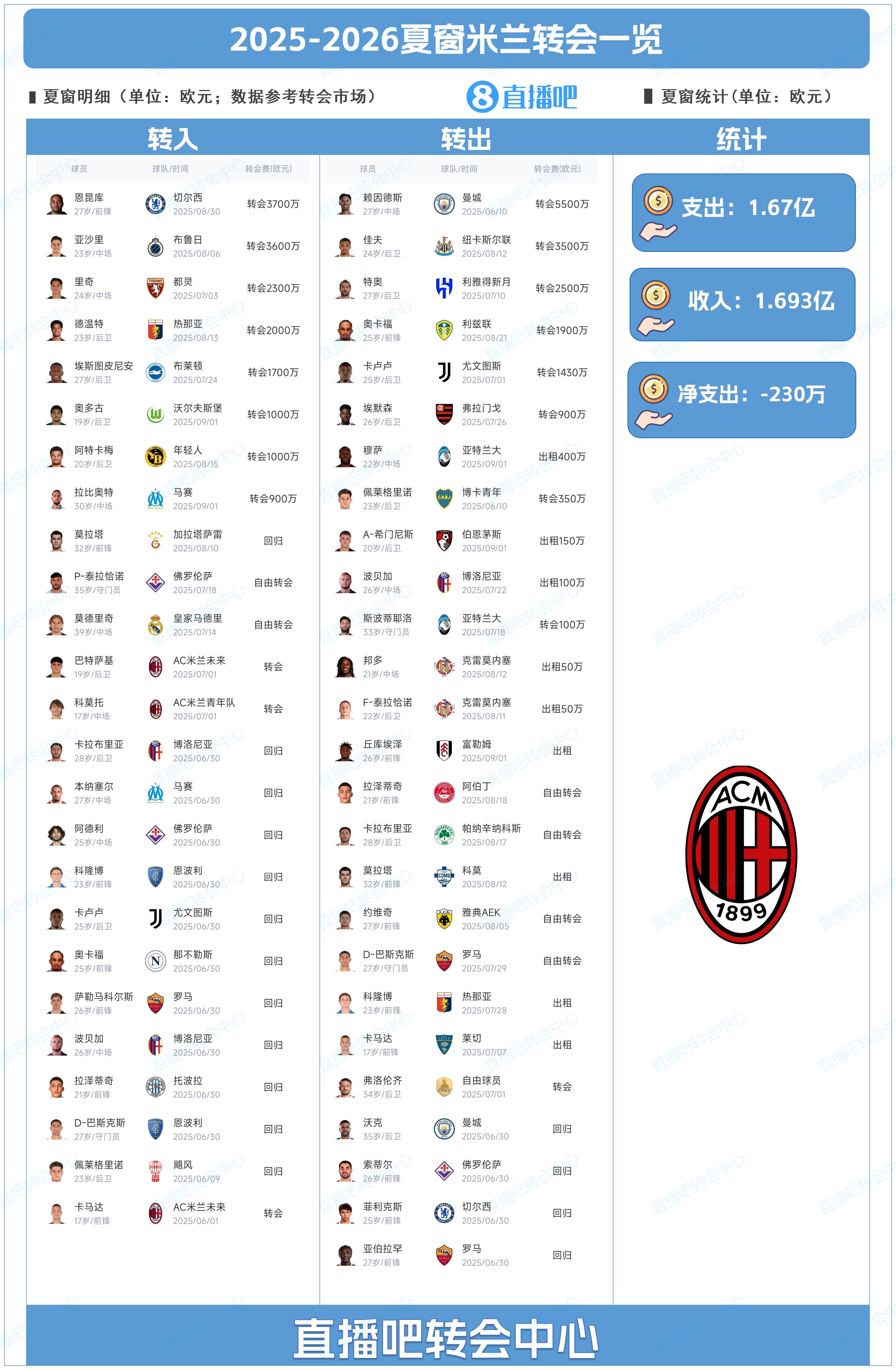 为吧友们回来了AC米兰今夏的转会操作,吧友们能打几分?