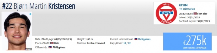 马丁-克里斯滕森,现年23岁,遵守于挪超KFUM,德回身价27.5万欧。他的母亲是菲律宾东谈主,2024年9月他雅致归化菲律宾,代表菲律宾出场14次打进12球。