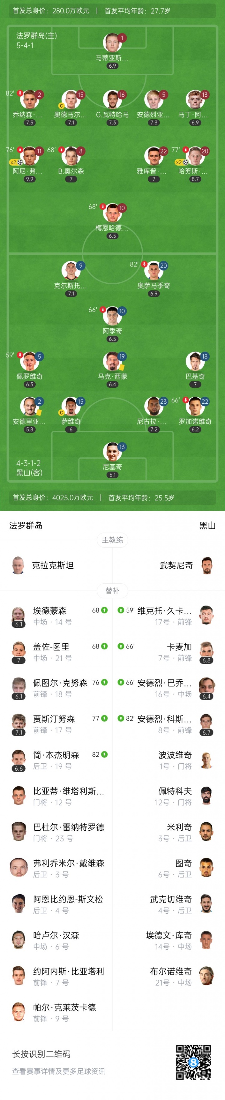对比两队的气势,法罗群岛的首发11东谈主身价仅280万,大部分球员皆在原土联赛遵循;而黑山锋线坐拥两位贯注甲遵循的球员,亚特兰大的克尔斯托维奇和尤文的阿季奇,首发11东谈主身价4025万欧。