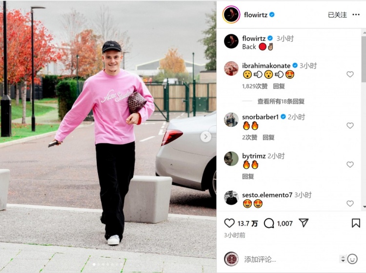 10月18日讯 维尔茨更新社媒动态,晒出顾忌俱乐部践诺的像片。