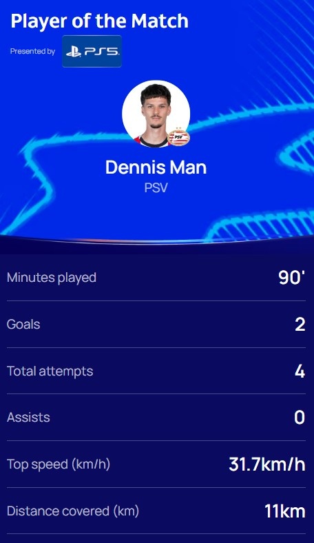 本场比赛埃因霍温球员丹尼斯-曼进展出色,梅开二度,4次射门,跑动距离达到11km,赛后他也当选欧冠官方评比出的本场最好球员。