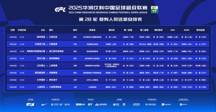 10月24日讯 中超官方公布第28轮裁判安排,乌兹别克斯坦裁判坦塔舍夫法律证据泰山vs海港,马宁法律证据国安vs海牛。