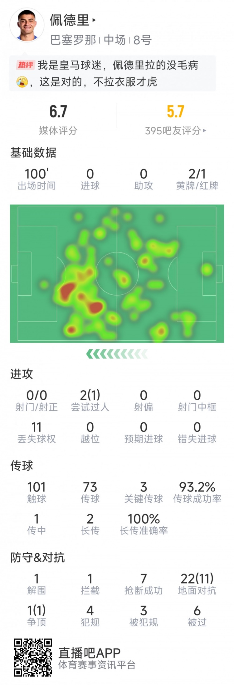10月27日讯 在本轮西班牙国度德比,皇马2-1打败巴萨,佩德里在终末工夫被红牌罚下,以下为他在本场数据: