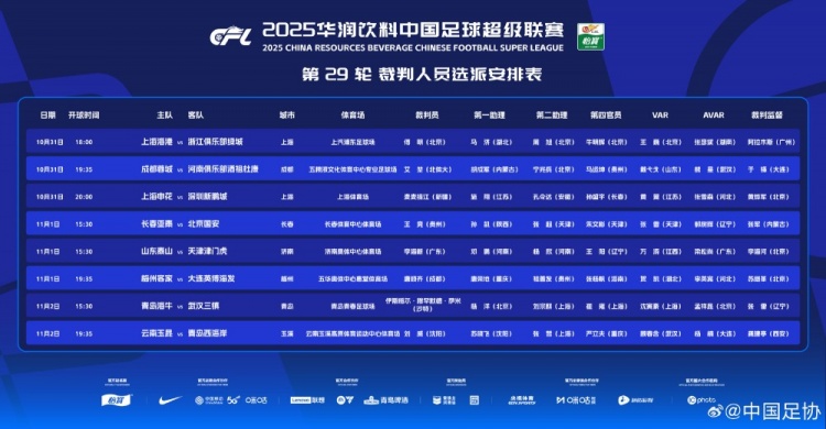 10月31日讯 中国足协公布了中超第29轮裁判遴派名单,其中傅明法则海港vs浙江,沙特裁判穆罕默德-萨米法则海牛vs三镇。