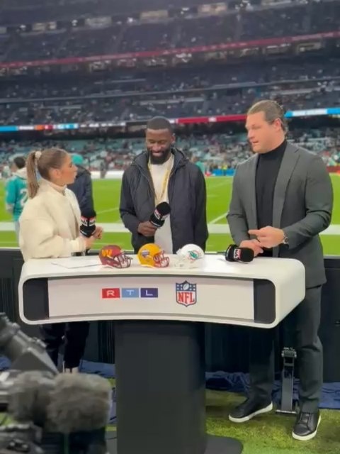 NFL西班牙赛昨晚在伯纳乌球场进行,迈阿密海豚16-13打败华盛顿指点官,吕迪格受邀现场不雅看这场比赛,并被请上驳斥席。他在酬酢媒体上晒出相片,皆达内出镜。