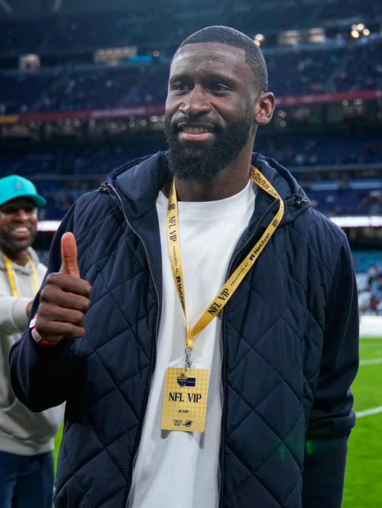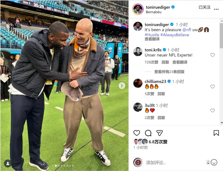11月17日讯 皇马后卫吕迪格更新社媒动态,晒出现场不雅战NFL(好意思国职业橄榄球定约)西班牙赛的相片。