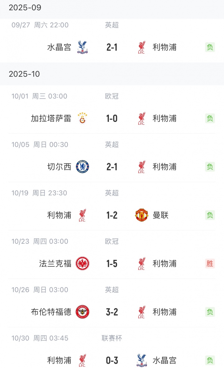 利物浦自9月27日以来战绩↓