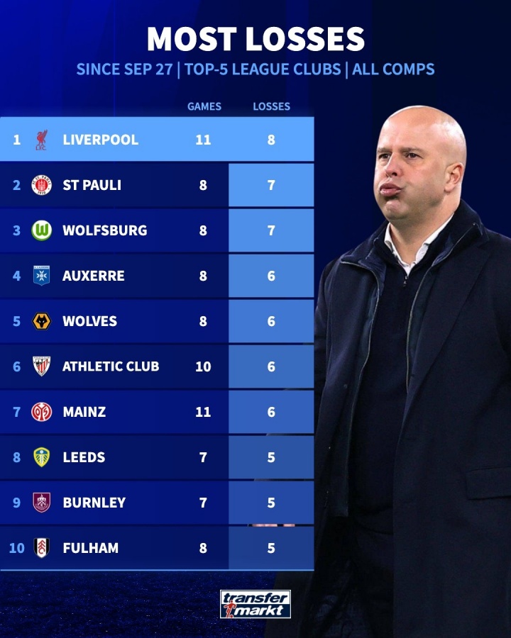 11月24日讯 德转统计了自9月27日以来五大联赛球队的输球榜,利物浦以8场比赛高居榜单第一位。