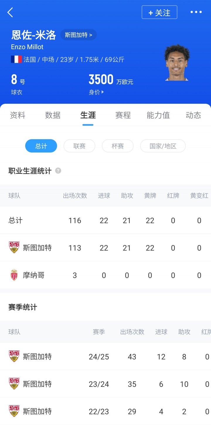恩佐-米洛,23岁法国中场,上赛季代表斯图加超过战43场比赛,孝顺12球8助,现在德回身价3500万欧。