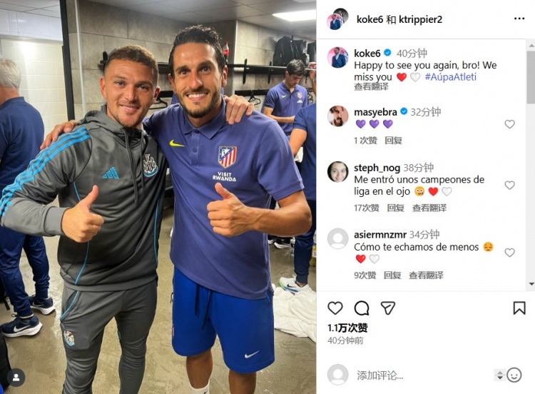 8月10日讯 季前友谊赛,马竞以2-0的比分驯服纽卡。本场比赛,马竞旧将特里皮尔为纽卡首发出战。赛后,马竞队长科克晒出了两东谈主的合影。