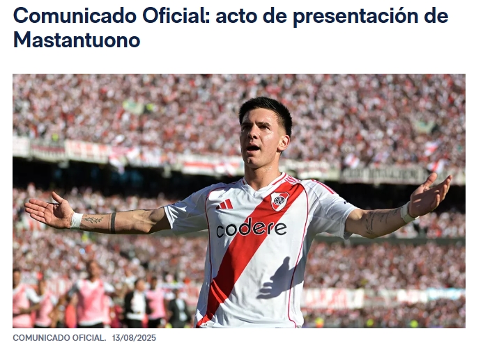 本年6月,皇马官宣签下马斯坦托诺,阐述河床官方的说法,马斯坦托诺的转会总价高达6320万欧元,成为阿根廷足坛史上最贵转会。撤离税费等其他用度,河床俱乐部将收到4500万欧的转会费。
