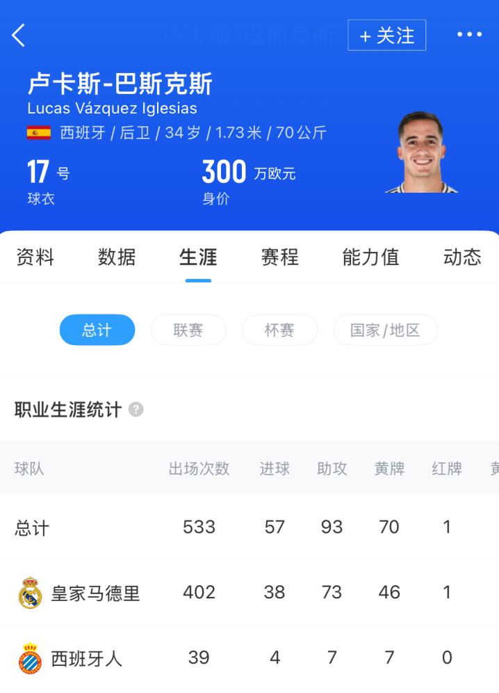 身高1.73米的巴斯克斯在2024/25赛季为皇马发达了要道作用,他代表球队出战53场认真比赛,其中32场为西甲,10场为欧冠。这位球员认为为皇马出场402次,作事糊口共夺得23个冠军。