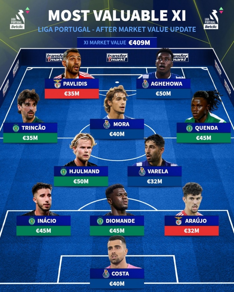 时尚:特林康(葡萄牙体育,3500万欧)、帕夫利季斯(本菲卡,3500万欧)、阿格霍瓦(波尔图,5000万欧)、昆达(葡萄牙体育,4500万欧)