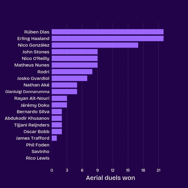 10月31日讯 数据机构squakwa统计了本赛季曼城队内的英超得手争顶情况,哈兰德和鲁本-迪亚斯并排最多。