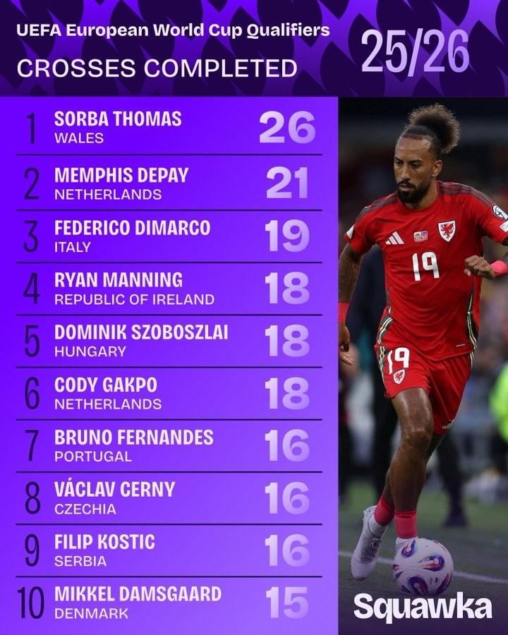 11月20日讯 本届世欧预小组赛仍是告一段落,squakwa也统计了本届赛事奏凯传中情况,威尔士边锋索尔巴·托马斯领跑。