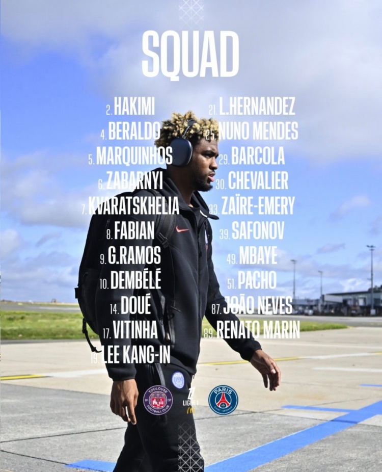时尚: 7-克瓦拉茨赫利亚、9-贡萨洛-拉莫斯、10-登贝莱、14-杜埃、19-李刚仁、29-巴尔科拉、49-姆巴耶
