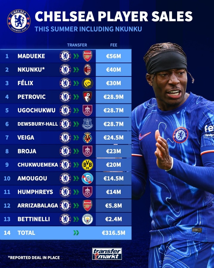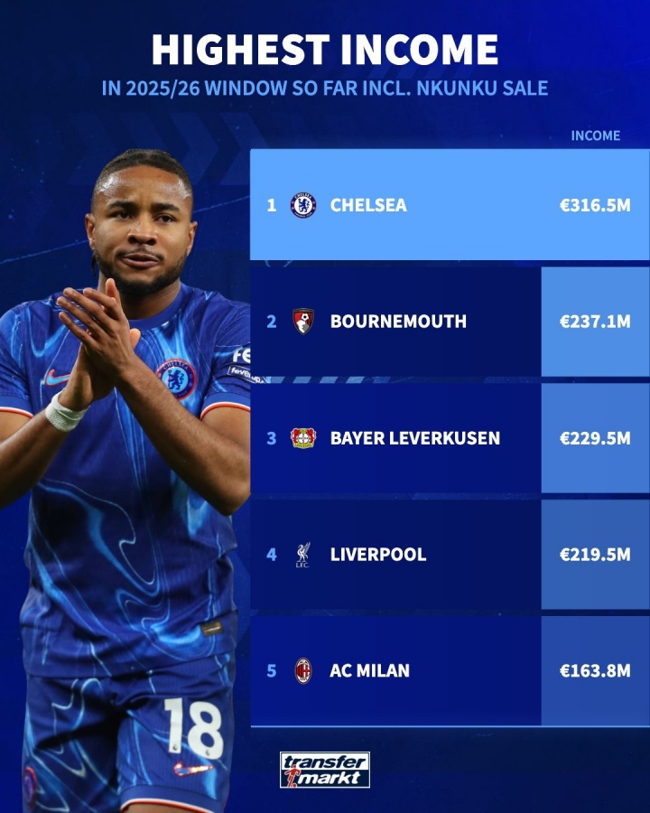 据德转统计,切尔西今夏卖东谈主总收入将达到3.165亿欧元,冠绝专家,比卖东谈主榜第二位的伯恩茅斯多了近8000万欧元。