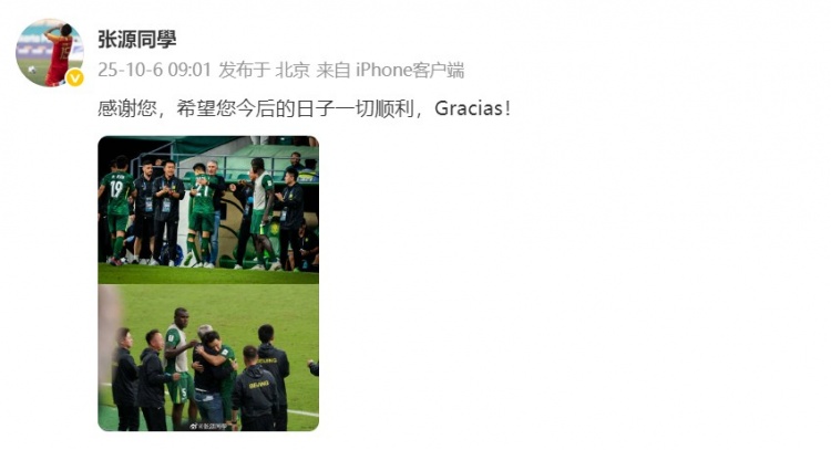 10月6日讯 昨晚,北京国安俱乐部官方告示主帅塞蒂恩离任。国安球员张源更新个东说念主微博,向塞蒂恩奉上道喜。