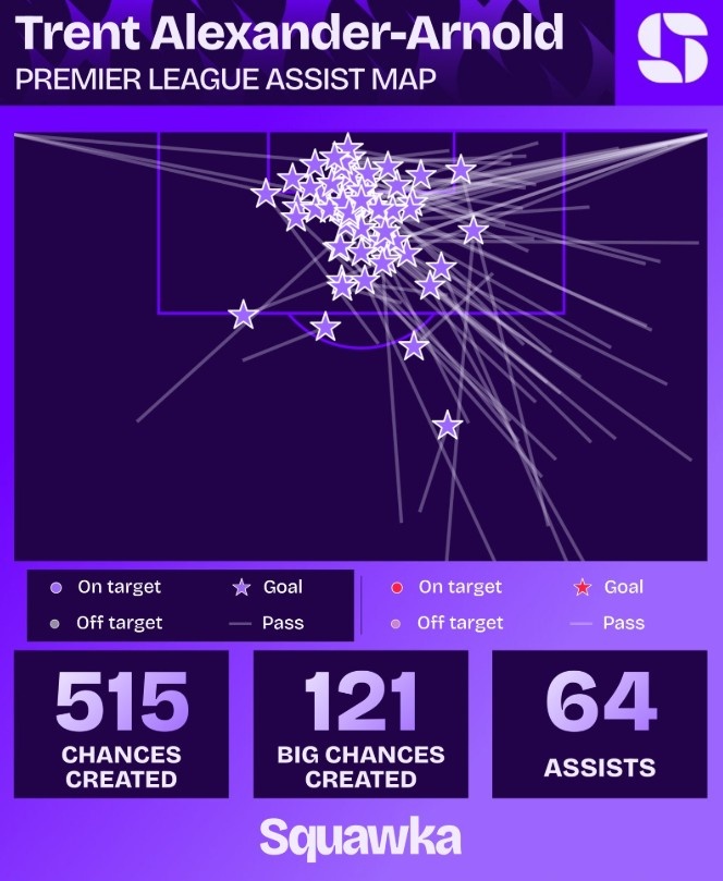 阿诺德以64次助攻成为英超历史助攻数最多的后卫,他亦然英超历史单赛季送出助攻最多的后卫。另外,他还两次作念到贯穿5场比赛在英超中送出助攻。