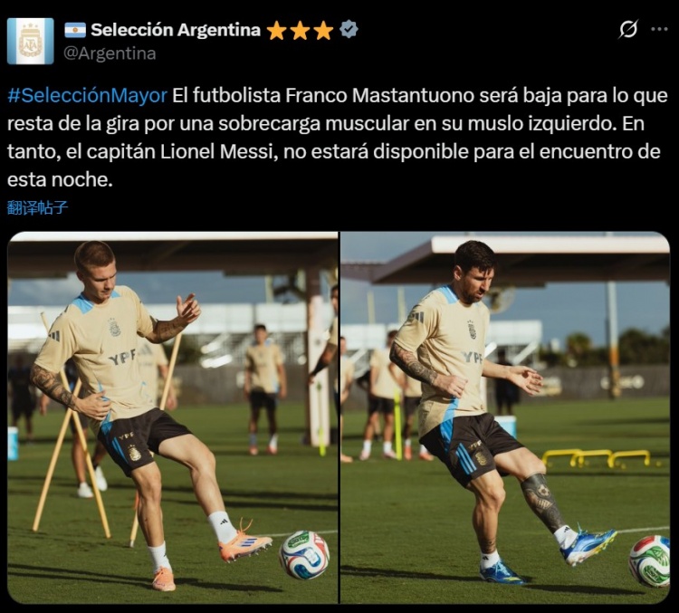 阿根廷官方写谈:“球员马斯坦托诺的左大腿肌肉过度疲惫,将缺席接下来的巡回比赛。与此同期,队长梅西也将缺席今晚的比赛。”