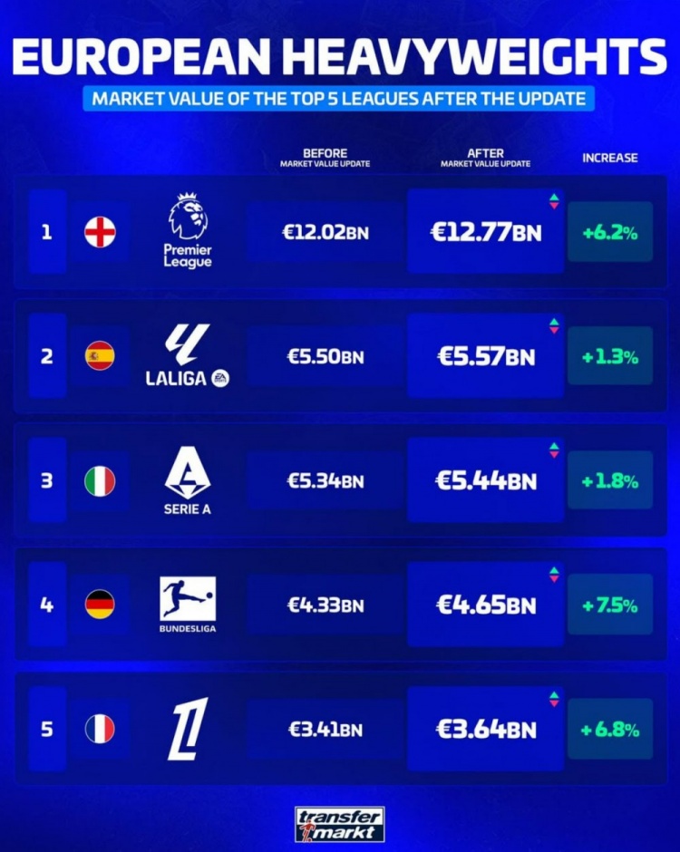 10月20日讯 德转此前更新了足坛球员身价,并清点了五大联赛球队总身价榜,其中英超遥遥跳跃,以下为具体情况: