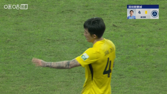 10月31日讯 中超第29轮,上海申花vs深圳新鹏城,比赛第39分钟,姜至鹏回击时将高天意撞出场外,同期还撩腿踢到对方裆部,被主裁判出示黄牌。姜至鹏累计四黄停赛,无缘联赛收官战。