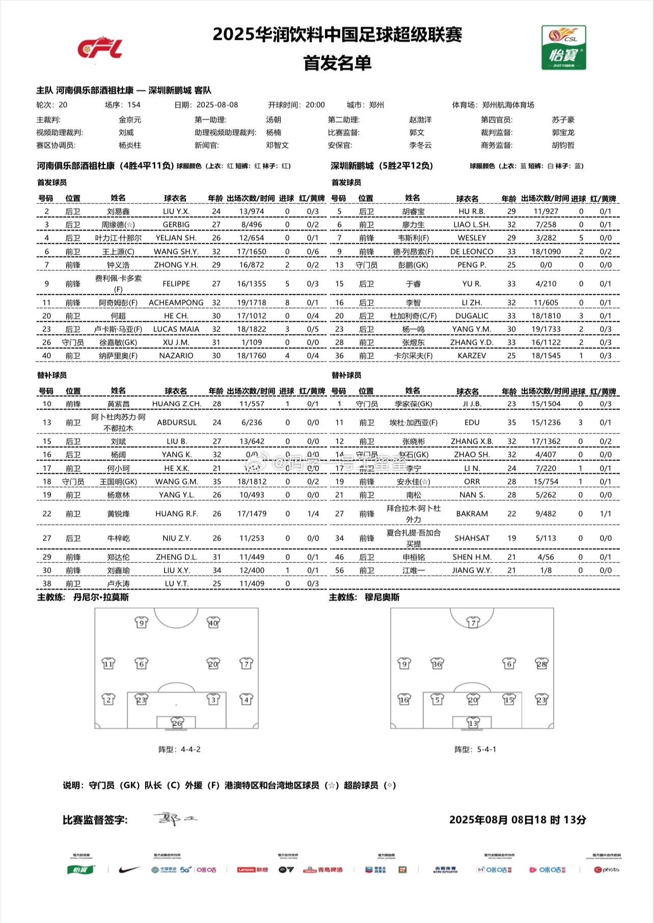 北京时辰8月8日20:00,中超联赛第20轮,河南镇守主场对阵深圳新鹏城,本场比赛主裁判是金京元,VAR是刘威,赛前两边公布首发: