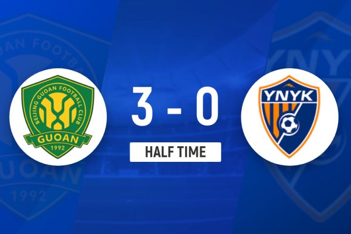 直播吧8月20日讯 足协杯半决赛,北京国安半场3-0擢升云南玉昆。