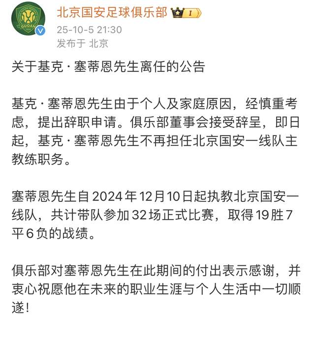 国安联赛掉链子也罢,在莫得赛程破费的情况下,亚冠二级联赛对阵麦克阿瑟fc的比赛,球队0-3输球,成为了压死骆驼的终末一根稻草,主教师塞蒂恩不上主力,球员斗志不及,一场完败之后,北京国安必须要作念出篡改了,不然独一的指望足协杯决赛对阵河南队,恐怕也会白费来回一场空,国安官宣塞蒂恩下课,适度了他在国安的糊口。